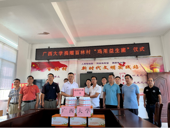 在捐赠仪式座谈会上,夏国恩认真听取百林村第一书记梁迪顺的工作汇报。他指出,学校十分重视乡村振兴帮扶工作,希望驻村第一书记要贯彻落实好党中央、教育部和自治区党委关于乡村振兴的战略部署,努力做好巩固拓展脱贫攻坚成果同乡村振兴有效衔接工作,希望农牧产业发展研究院继续发挥“科技帮扶”优势,增强对口帮扶的力度,积极打造乡村振兴的“西大样板”。随后,夏国恩副校长代表学校向百林村捐赠“鸡用益生菌”,帮扶百林村发展养鸡产业,助力村集体经济发展。