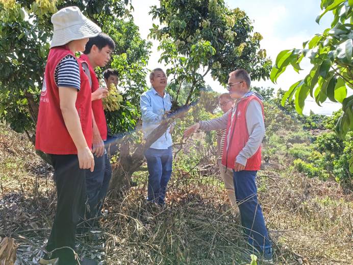 下午,科技特派员们到已进行高接换种的荔枝园现场指导荔枝抹芽、整形及草害、虫害和施肥的技术。