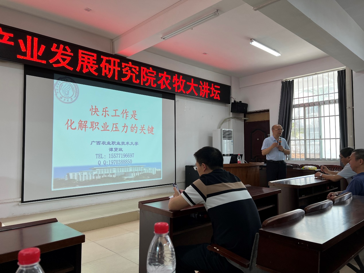 2024年,农牧产业发展研究院迎来建院五周年。为总结农发院发展历程,推动各项事业又好又快发展,更好的服务人才培养和乡村振兴,院领导班子研究决定,从3月起举办“农牧大讲坛”系列活动。2024年3月27日下午,邀请广西农业职业技术大学教师、国家高级心理培训师谭贤政博士在产业楼201会议室进行了《快乐工作是化解职业压力的关键》的讲座,谭博士从为什么要快乐工作、快乐工作的策略和途径等维度给师生讲授快乐工作的要义及缓解工作压力的方式方法,讲座内容专业新颖,形式生动活泼,语言幽默风趣,得到师生们的好评和喜爱。