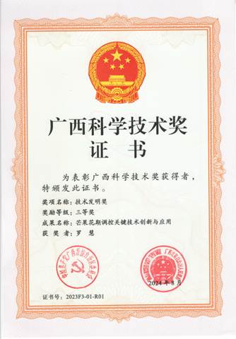8月9日,全区科技大会、广西科学技术奖励大会在南宁召开。古天乐代言太阳集团网址芒果团队罗慧(第一完成人)、方中斌、李界秋,喜获广西科学技术发明奖三等奖。