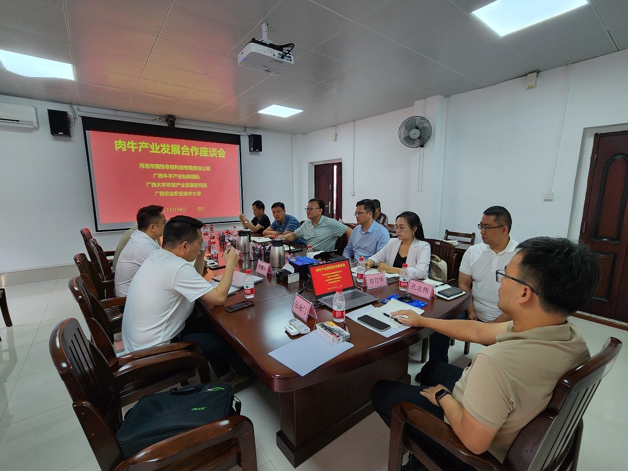 公司陈珑友副总经理首先介绍了公司的肉牛产业概况和产业发展规划,以及目前产业发展面临的困难和亟需技术团队帮助解决的问题,希望能与牛羊团队开展技术合作,依托团队技术支撑助力公司肉牛产业发展。韦英明首席专家对河池国投公司对广西牛羊产业创新团队的信赖表示感谢,对公司重视依托广西本土技术团队支撑发展产业的思路表示赞赏,河池市是广西的肉牛产业大市,河池市国投农牧科技有限责任公司是河池市政府领导下的平台公司,负责盘活河池市肉牛产业的资源,致力于做大做强河池市肉牛产业助力乡村振兴,广西牛羊团队义不容辞要做好产业技术支撑,团队定会竭力为河池市肉牛产业发展提供技术保障和服务,参会专家分别就各自专业技术领域同公司进行了交流,双方就技术合作的具体事项深入进行讨论沟通,以期推动尽早签署合作。
