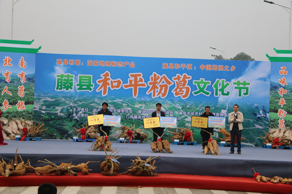 在文化节开幕式现场,应当地政府邀请,何书记为获得粉葛单株产量评比一等奖的农户颁奖,对长期坚持种植粉葛,不断钻研种植技术,屡创单产新高的农户表示赞赏和祝贺。