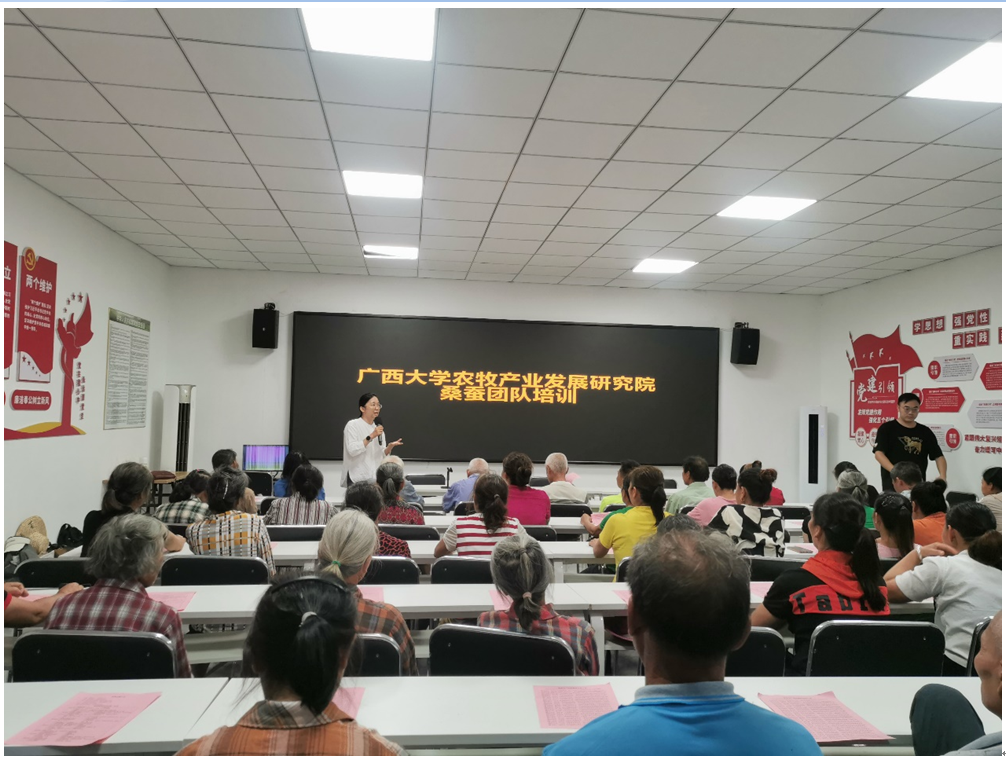 为提升桑蚕产业科技水平,助力农户增产增收,古天乐代言太阳集团网址农牧产业发展研究院梁湘老师受平果市科学技术协会邀请,于2025年7月25日在位于百色平果市坡造镇的中国农技协平果桑蚕科技小院,开展了“桑蚕生产防病增收关键技术”专题培训。来自时宜农业公司及周边地区的五十余位桑蚕种养大户齐聚一堂,共享科技兴农的实用知识。