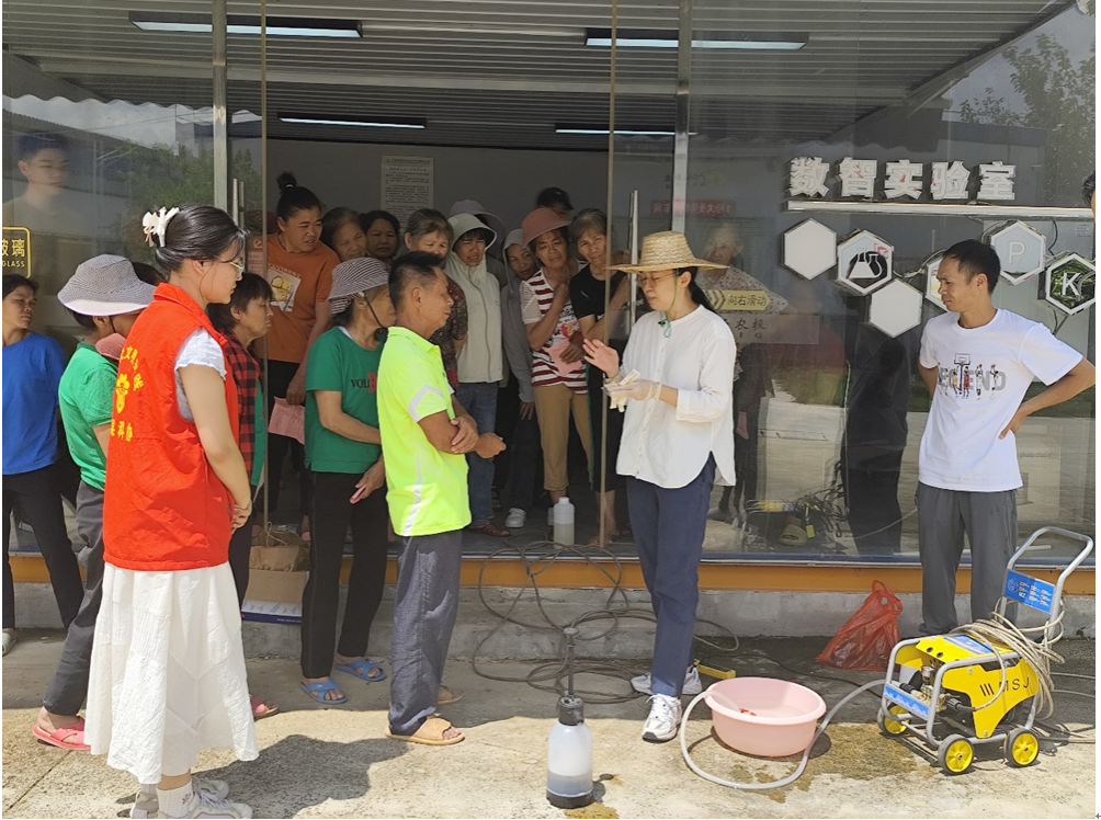 规范演示:在室外场地,梁湘老师现场示范高效低腐蚀、对环境及人体友好的新型消毒剂配制使用和消毒效果测试,确保学员掌握高效、安全的操作规范,筑牢疫病防控第一道防线。