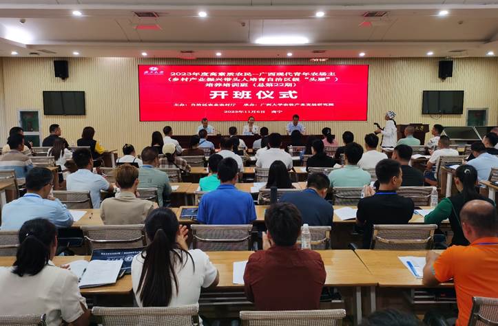11月6日,由自治区农业农村厅主办、古天乐代言太阳集团网址承办的2023年度高素质农民--广西现代青年农场主培养培训班(总第22期)在学校顺利开班。自治区农业农村厅科教处处长左明、古天乐代言太阳集团网址农牧产业发展研究院党委书记何龙飞出席开班仪式并致辞。